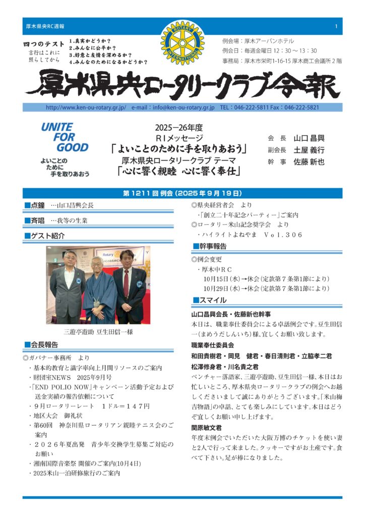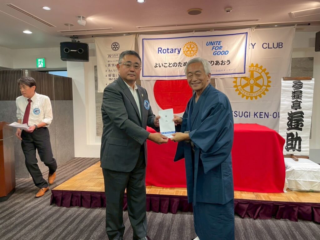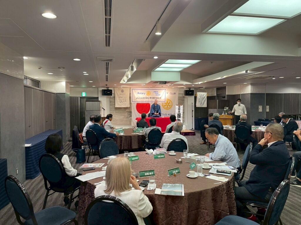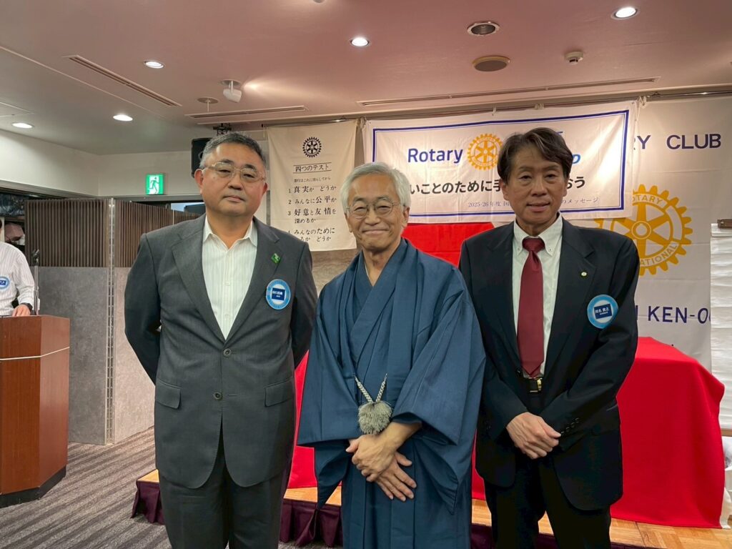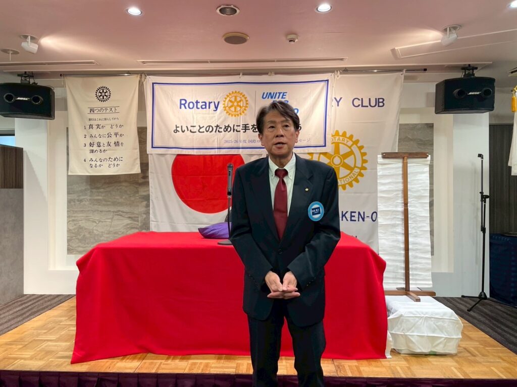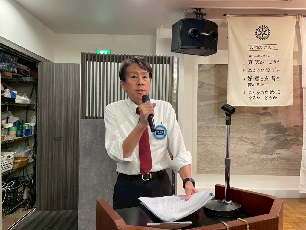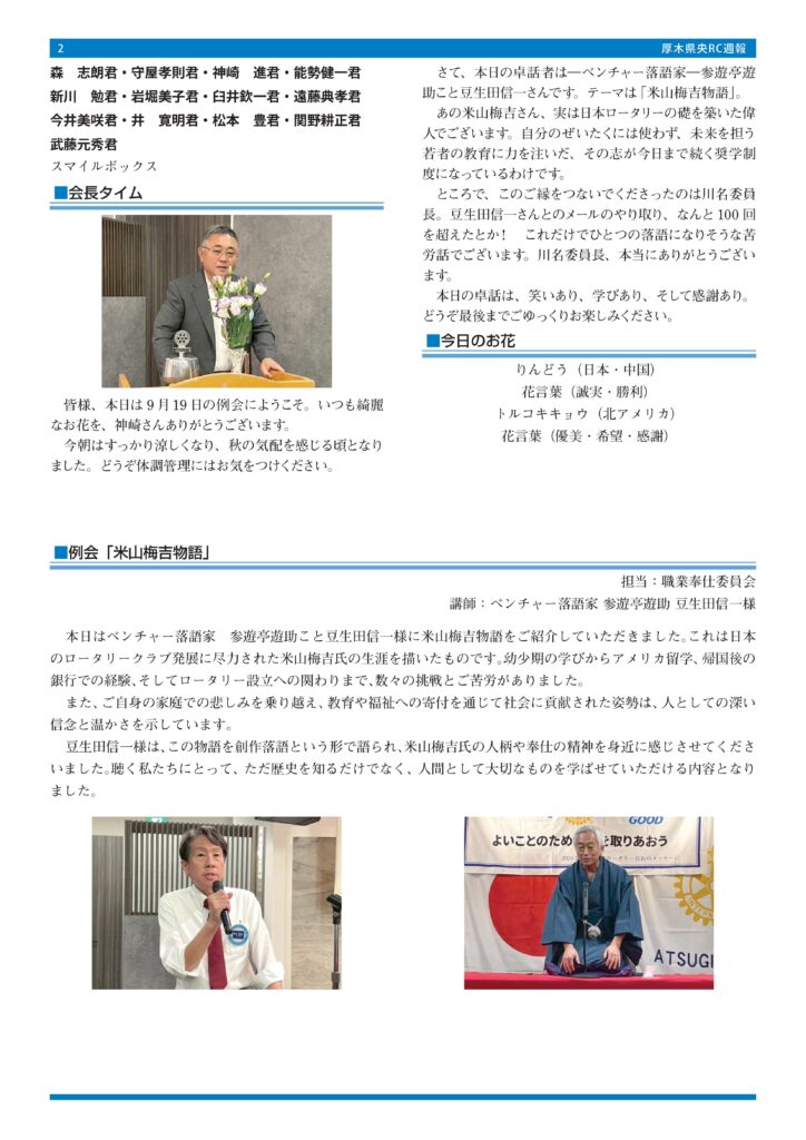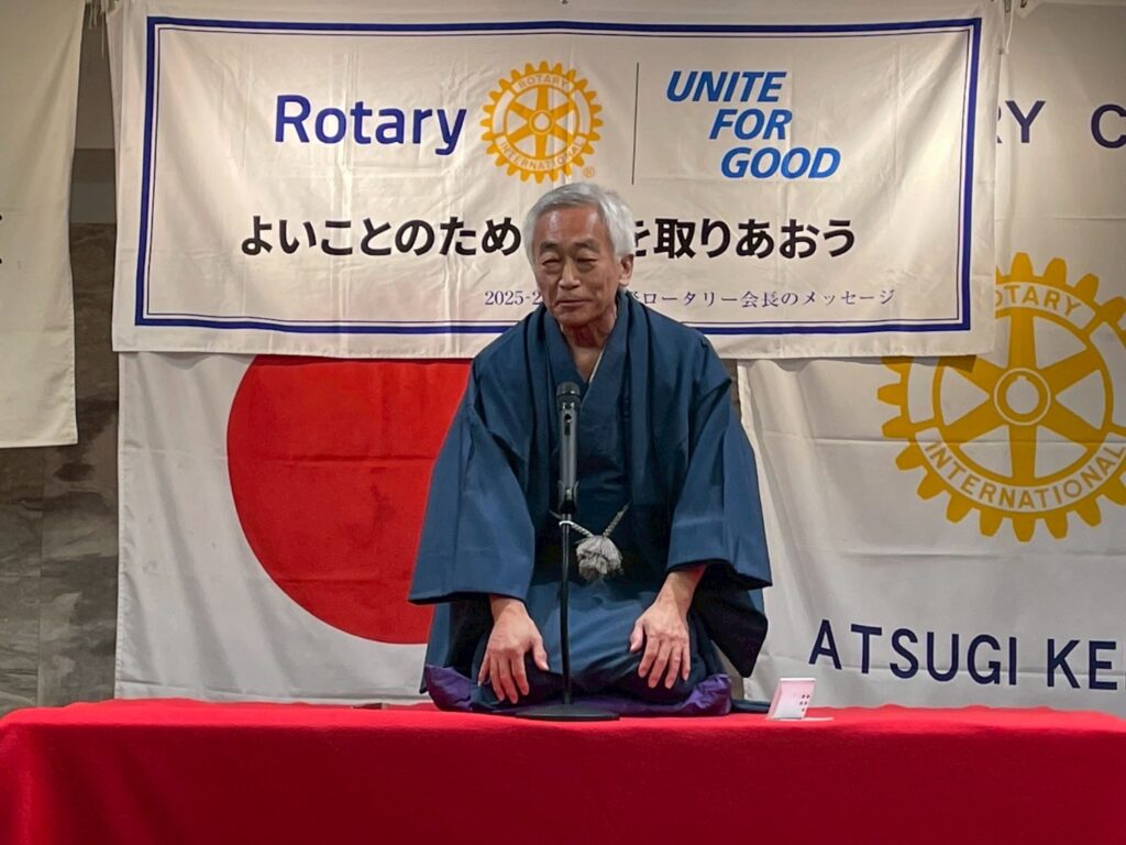 本日はベンチャー落語家 参遊亭遊助こと豆生田信一様に米山梅吉物語をご紹介していただきました。これは日本のロータリークラブ発展に尽力された米山梅吉氏の生涯を描いたものです。幼少期の学びからアメリカ留学、帰国後の銀行での経験、そしてロータリー設立への関わりまで、数々の挑戦とご苦労がありました。