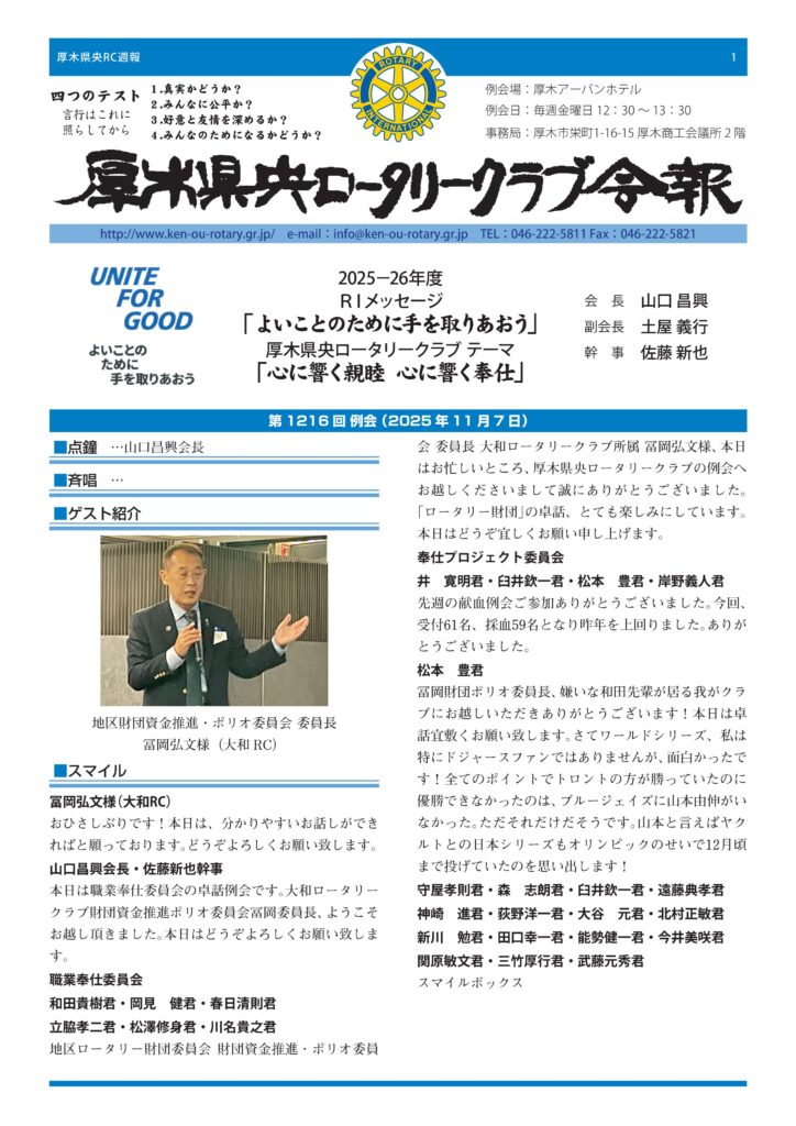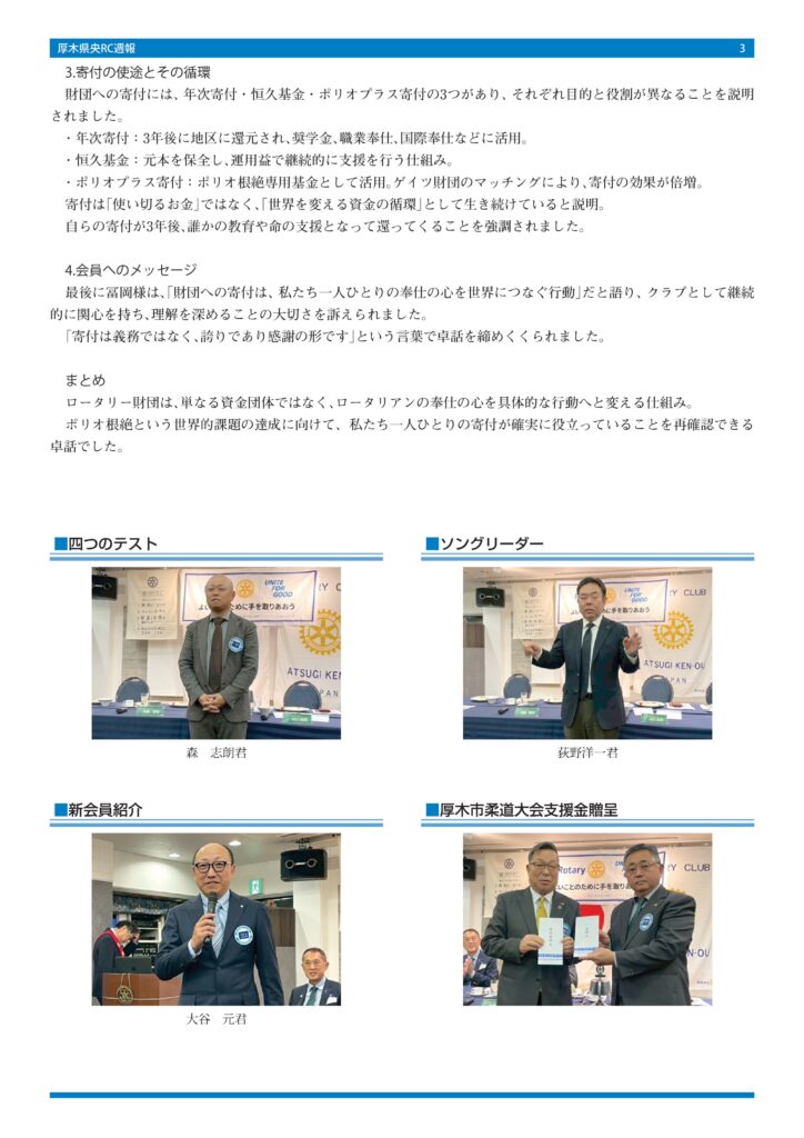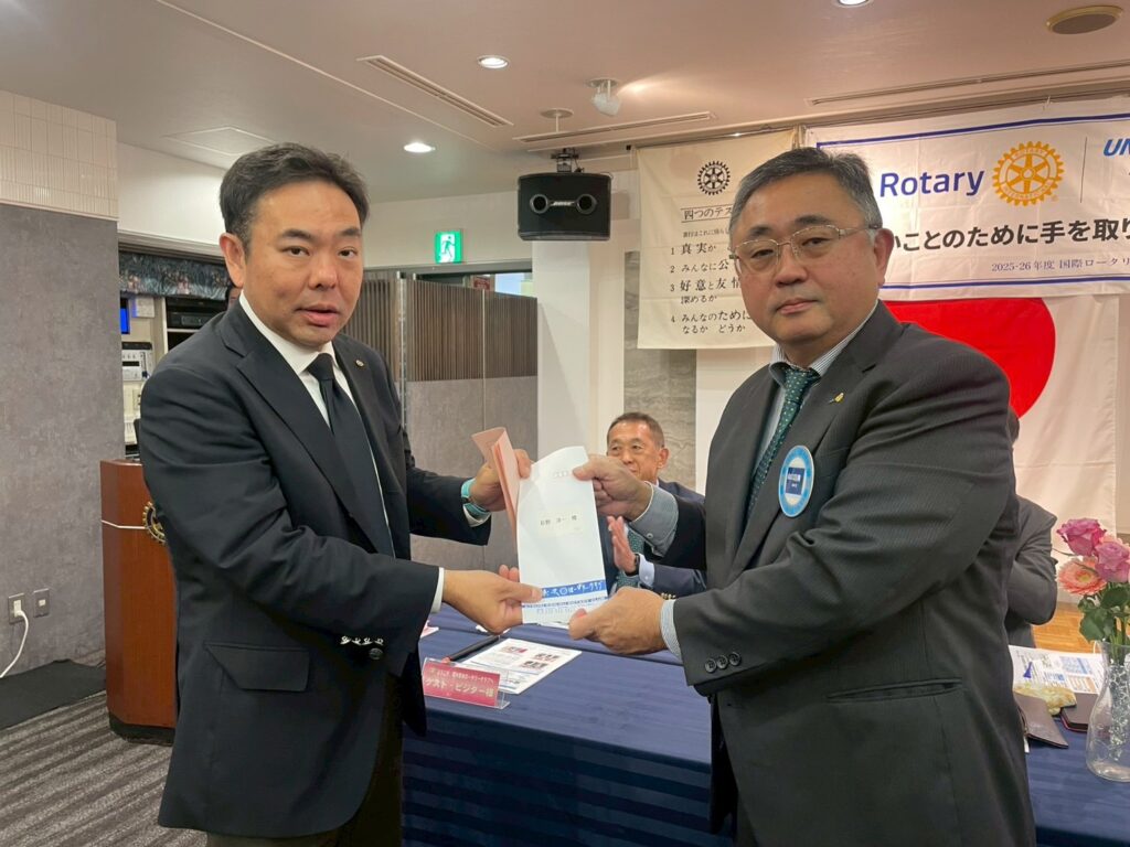 最後に冨岡様は、「財団への寄付は、私たち一人ひとりの奉仕の心を世界につなぐ行動」だと語り、クラブとして継続的に関心を持ち、理解を深めることの大切さを訴えられました。