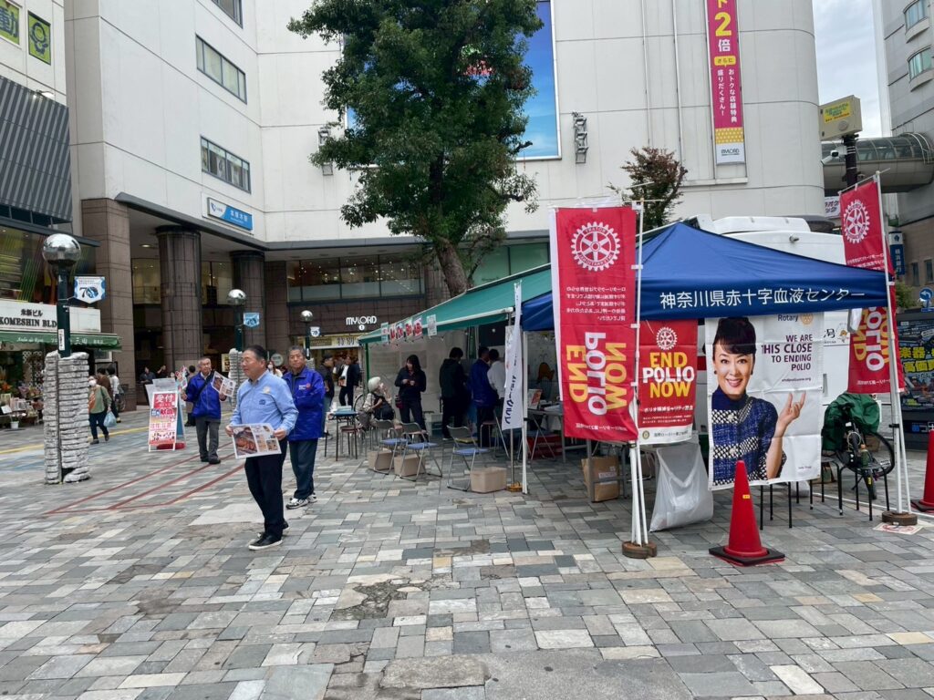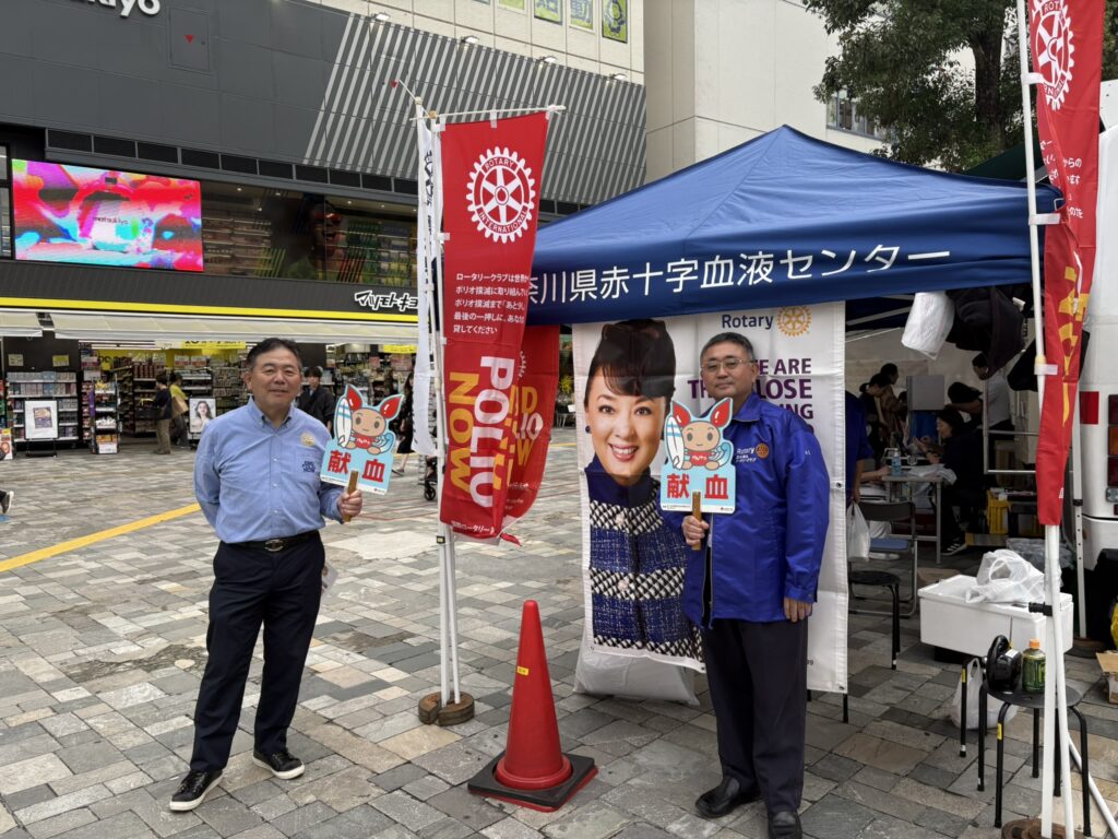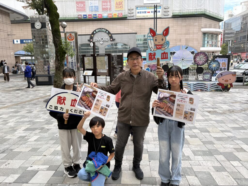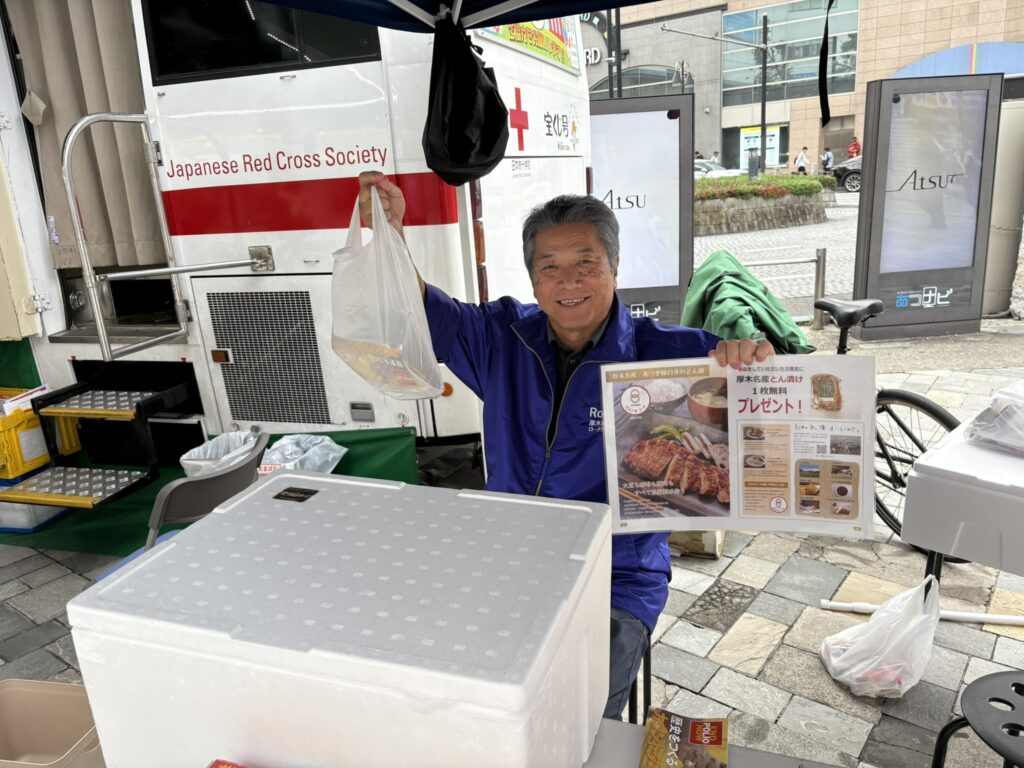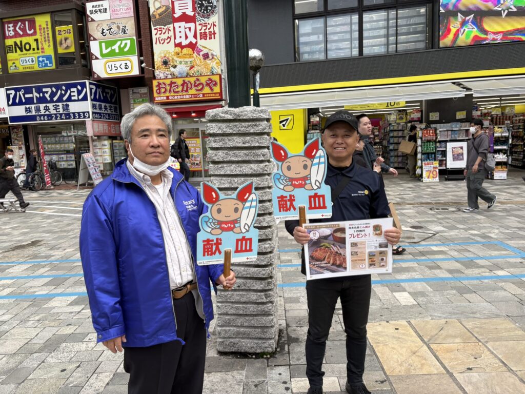 11月1日(土)に本厚木駅北口にて献血活動をしました。今年は献血して頂いた方へのプレゼントとして臼井会員から「とん漬け」と山口会長から「ソーセージ」が提供され、とても喜ばれました。採血者も59名の協力を得て目標の50名を上回りました。3連休にも関わらすたくさんのメンバーに出席して頂き有難う御座いました。