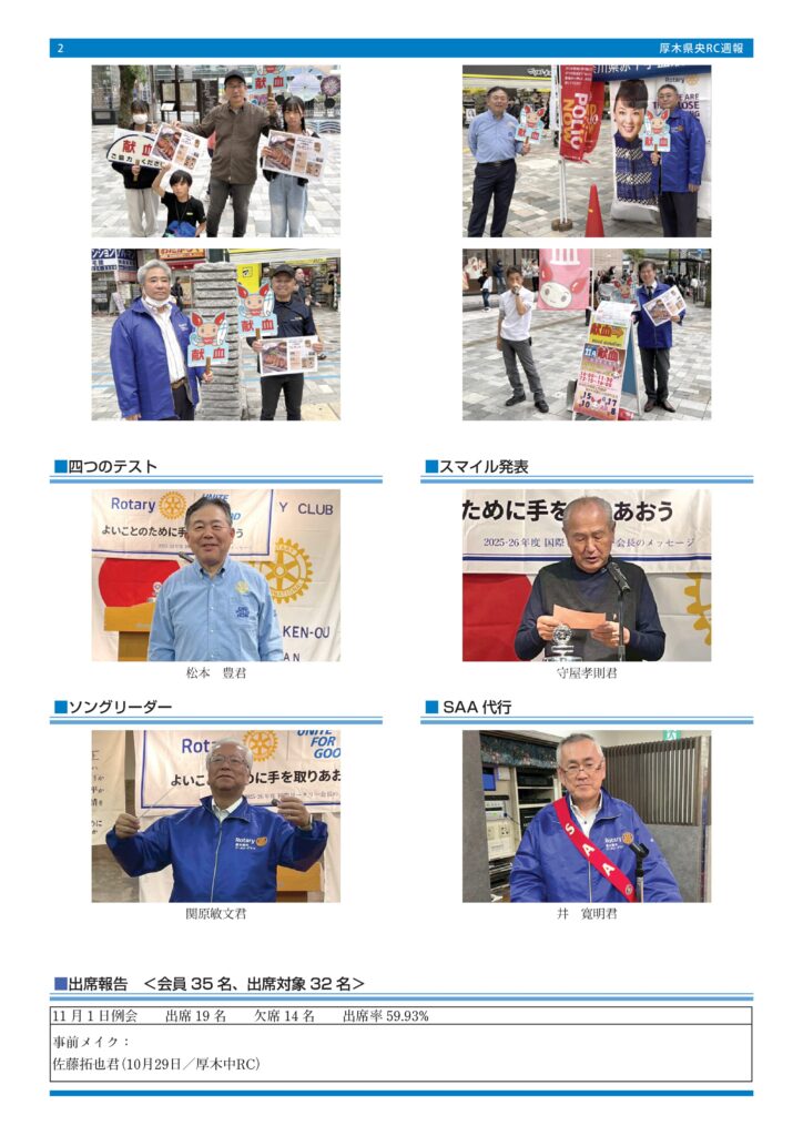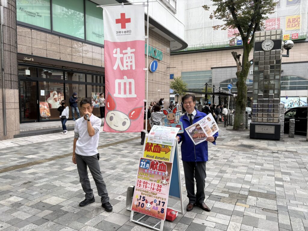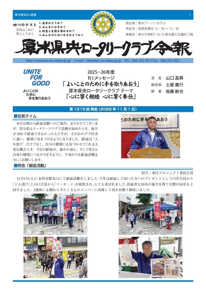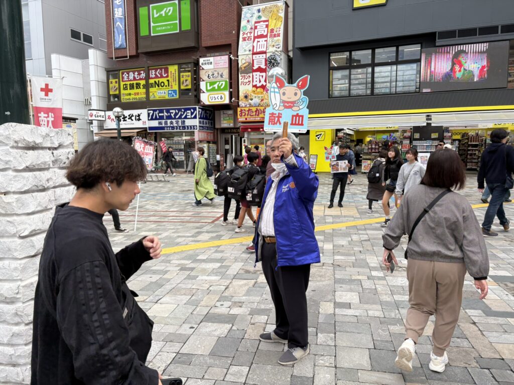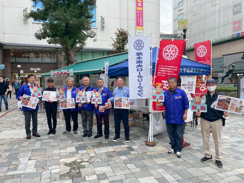 11月1日(土)に本厚木駅北口にて献血活動をしました。今年は献血して頂いた方へのプレゼントとして臼井会員から「とん漬け」と山口会長から「ソーセージ」が提供され、とても喜ばれました。採血者も59名の協力を得て目標の50名を上回りました。3連休にも関わらすたくさんのメンバーに出席して頂き有難う御座いました。