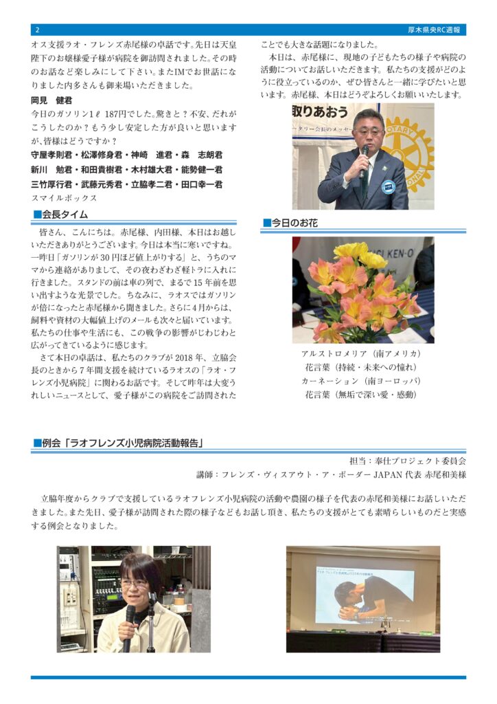 立脇年度からクラブで支援しているラオフレンズ小児病院の活動や農園の様子を代表の赤尾和美様にお話しいただ
